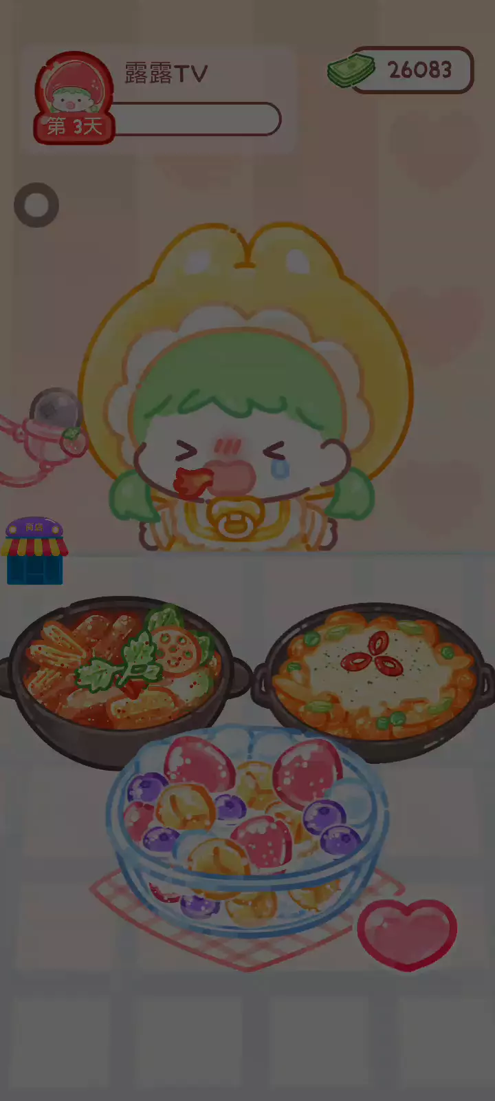 更新宠物!!! 「你进行草莓糖葫芦吃播的话,我就赞助100元。」 「脆口的声音太迷人了(°θ°)」 由于客人都被最近新开的许多糖葫芦店家抢走,曾经号称糖葫芦达人的父母因此卧病在床。 继承父母店面的主角露露开始糖葫芦吃播来宣传店面。 直到成为真正的糖葫芦达人那一天! 「今天我也要开始糖葫芦直播罗!( •o• )」 [串材料] 只有新鲜的水果的话,很难以一名吃播实况主存活下来。还要有松饼、地球软糖、青阳辣椒!利用奇特的材料制作糖葫芦吧。 [裹糖衣] 将材料串满竹签的话,就放进锅子搅动吧。唯有利用达人的秘法,才能裹出又薄又脆的糖衣。 [即时吃播] 咔哒咔哒!今天的吃播也大成功。热烈的聊天内容看起来反应也不错。看来得利用完成观众任务得到的赞助金来买新材料了! 来,准备好了吧?现在就马上挑战成为糖葫芦达人吧!