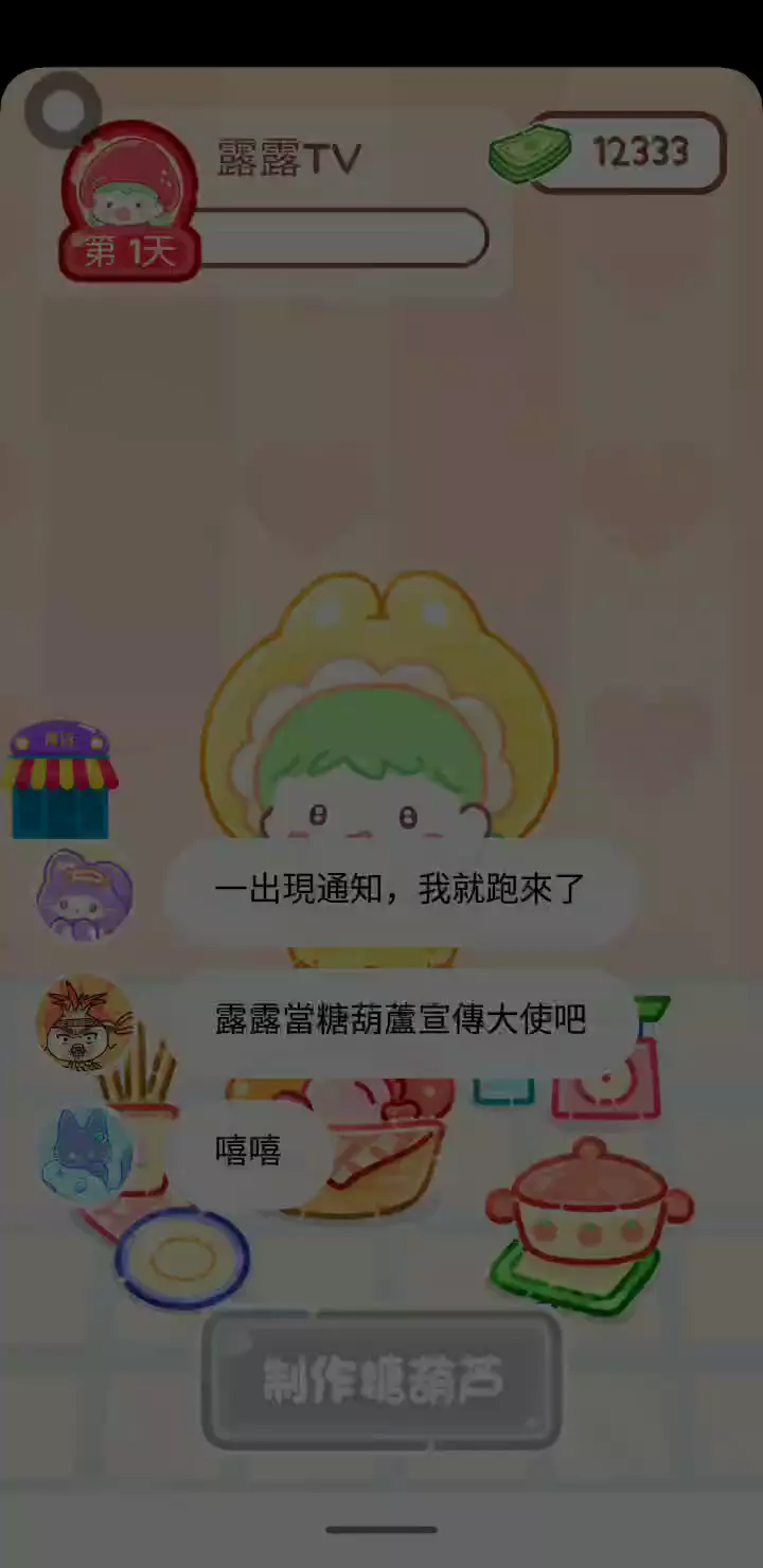 更新宠物!!! 「你进行草莓糖葫芦吃播的话,我就赞助100元。」 「脆口的声音太迷人了(°θ°)」 由于客人都被最近新开的许多糖葫芦店家抢走,曾经号称糖葫芦达人的父母因此卧病在床。 继承父母店面的主角露露开始糖葫芦吃播来宣传店面。 直到成为真正的糖葫芦达人那一天! 「今天我也要开始糖葫芦直播罗!( •o• )」 [串材料] 只有新鲜的水果的话,很难以一名吃播实况主存活下来。还要有松饼、地球软糖、青阳辣椒!利用奇特的材料制作糖葫芦吧。 [裹糖衣] 将材料串满竹签的话,就放进锅子搅动吧。唯有利用达人的秘法,才能裹出又薄又脆的糖衣。 [即时吃播] 咔哒咔哒!今天的吃播也大成功。热烈的聊天内容看起来反应也不错。看来得利用完成观众任务得到的赞助金来买新材料了! 来,准备好了吧?现在就马上挑战成为糖葫芦达人吧!