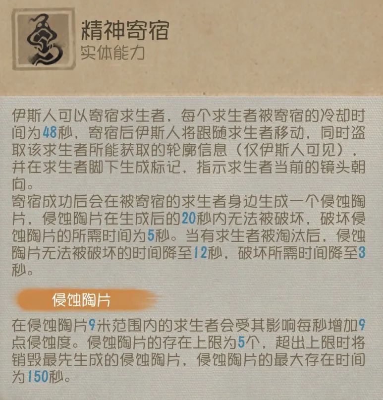伊斯人可以寄宿求生者(每个求生者被寄宿的CD为48秒),寄生成功后跟着求生者移动且寄宿倒地或上椅的求生者时可以看到求生者的视角和队友(可利用此能力在守椅时寄生求生者来观察其他求生者的位置并进行拦截)。寄宿成功后可在原地生成一块侵蚀陶片(生成后20秒内无法被破坏),侵蚀陶片附近的求生者每秒会增加9点侵蚀度,侵蚀陶片最多存在5个,超过5个将会销毁最先生成的侵蚀陶片,每个侵蚀陶片的最大存在时间为150秒(当有求生者被淘汰后,陶片无法被破坏的时间降低至12秒,破坏所需时间降低至3秒)。