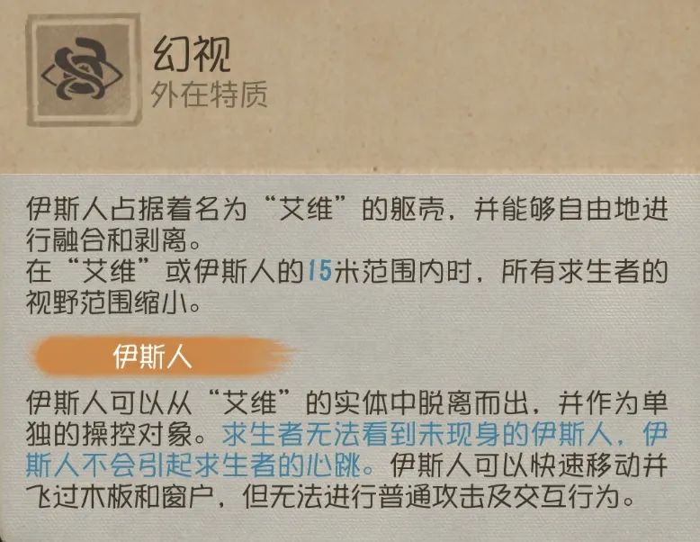 “艾维”可以分裂出伊斯人,伊斯人的恐惧范围小,并且不会引起求生者心跳,还可以快速移动并飞过木板和窗户,但无法进行普通攻击和交互。