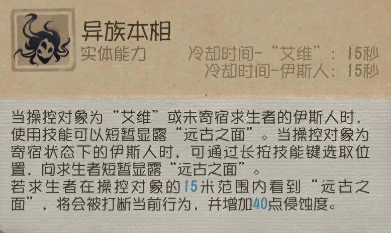 ① 当求生者在15米范围内看向伊斯人或者“艾维”,可以发动技能打断求生者的动作(包括使用技能以及交互),并增加40点侵蚀度;