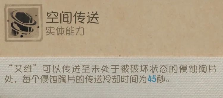 艾维可以传送至未处于被破坏状态的侵蚀陶片处,每个陶片冷却时间45秒。