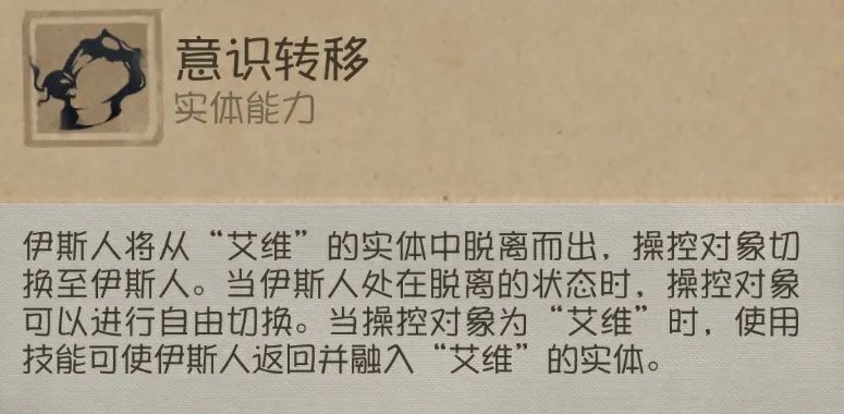 使用技能伊斯人将脱离“艾维”的实体,此时控制伊斯人,可以在伊斯人和“艾维”之间自由切换操控对象,操作“艾维”时使用技能将会收回伊斯人。