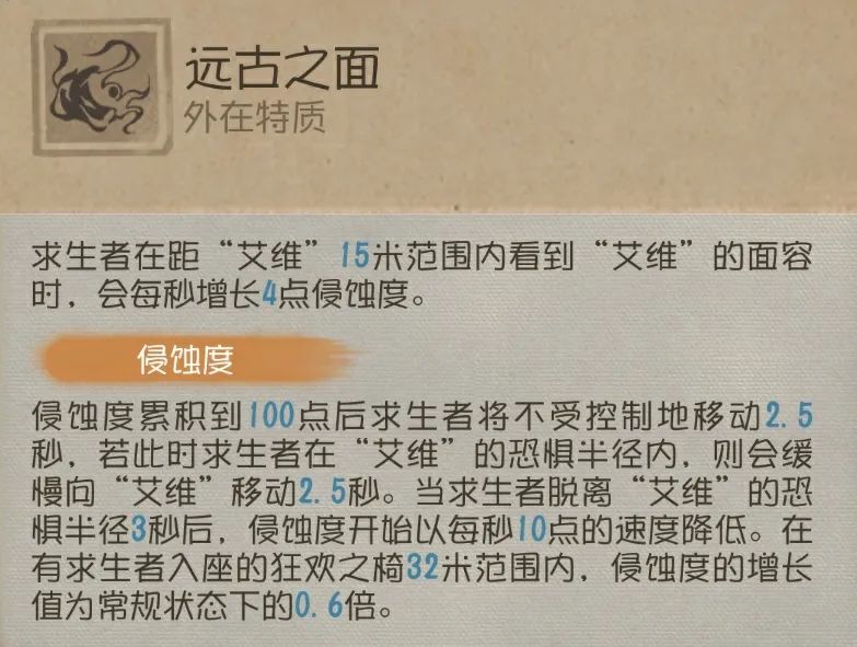在一定距离内盯着“艾维”就会增加侵蚀度,侵蚀度达到100会有一个强控制效果,让其不受控制地移动2.5秒,如果在恐惧半径内则会朝着“艾维”移动。如果在有求生者入座的狂欢之椅附近则会降低侵蚀的增长速度。