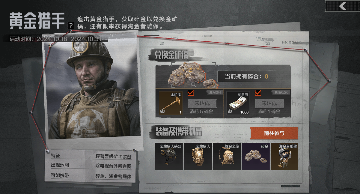 黄金猎手将出现在农场、北部山区、山谷、军港、前线要塞及矿区地图内。