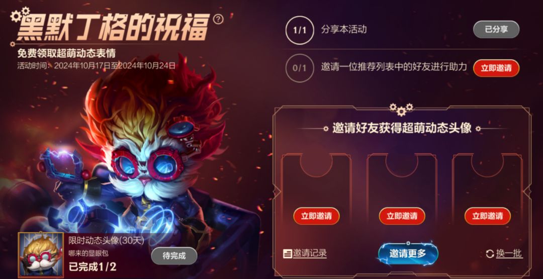 请接收来自伟大发明家-黑默丁格的祝福!即日起,截止至10月24日,召唤师完成活动任务即可获得动态头像-哪来的显眼包(30天)奖励。