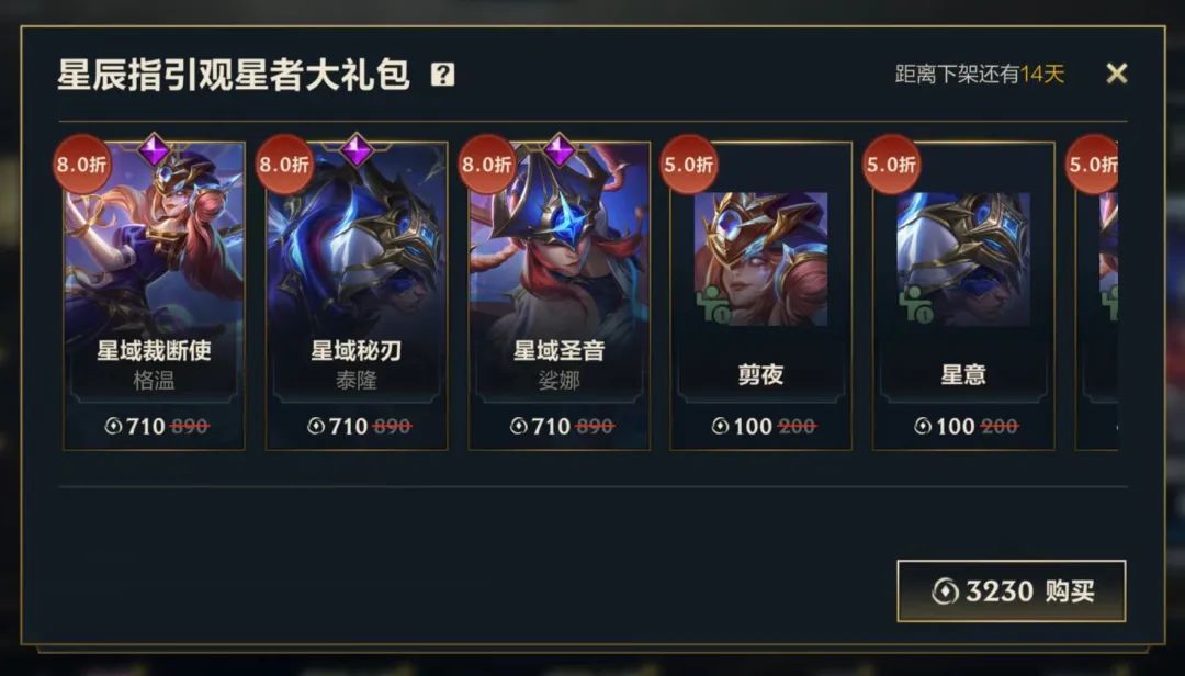 截止至10月30日,召唤师们可前往商城,使用3230点券获取星辰指引观星者大礼包,礼包内包含8折优惠的星域裁断使 格温、星域秘刃 泰隆、星域圣音 娑娜3款皮肤,还包含各皮肤对应英雄姿态、皮肤边框以及头像-星域裁决、家园卫士-星域遐想等5折好礼~