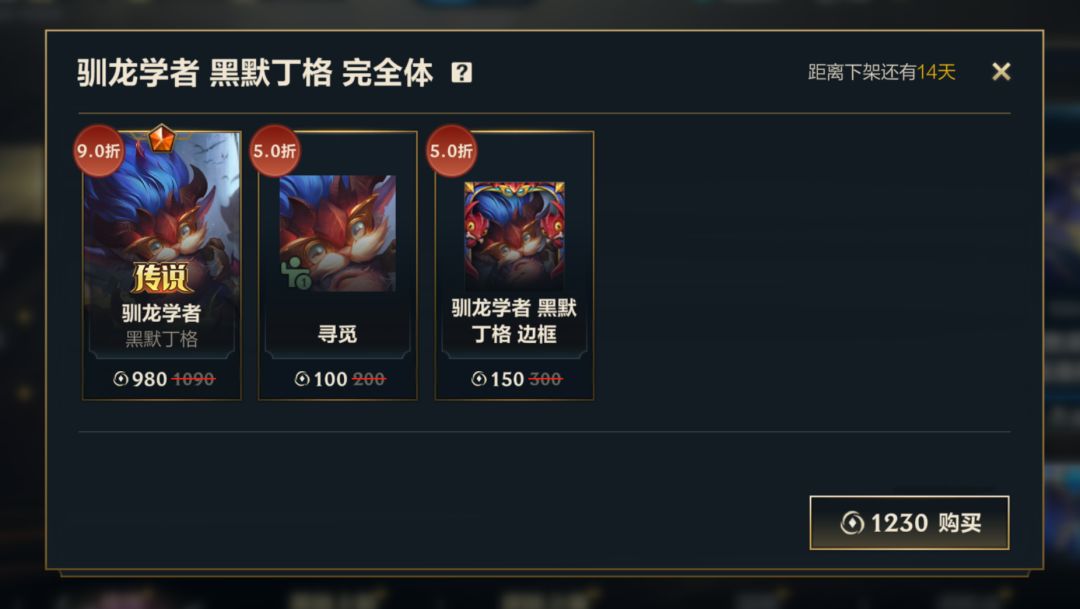 驯龙学者 黑默丁格 完全体礼包也在限时优惠出售中!即日起,截止至10月30日,召唤师可以使用1230点券购入完全体礼包,礼包内包含9折优惠的驯龙学者 黑默丁格皮肤,更有5折优惠的姿态-寻觅和皮肤边框-驯龙学者 黑默丁格。