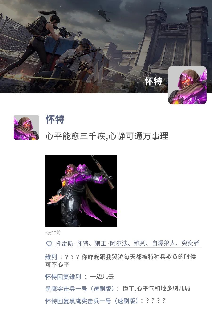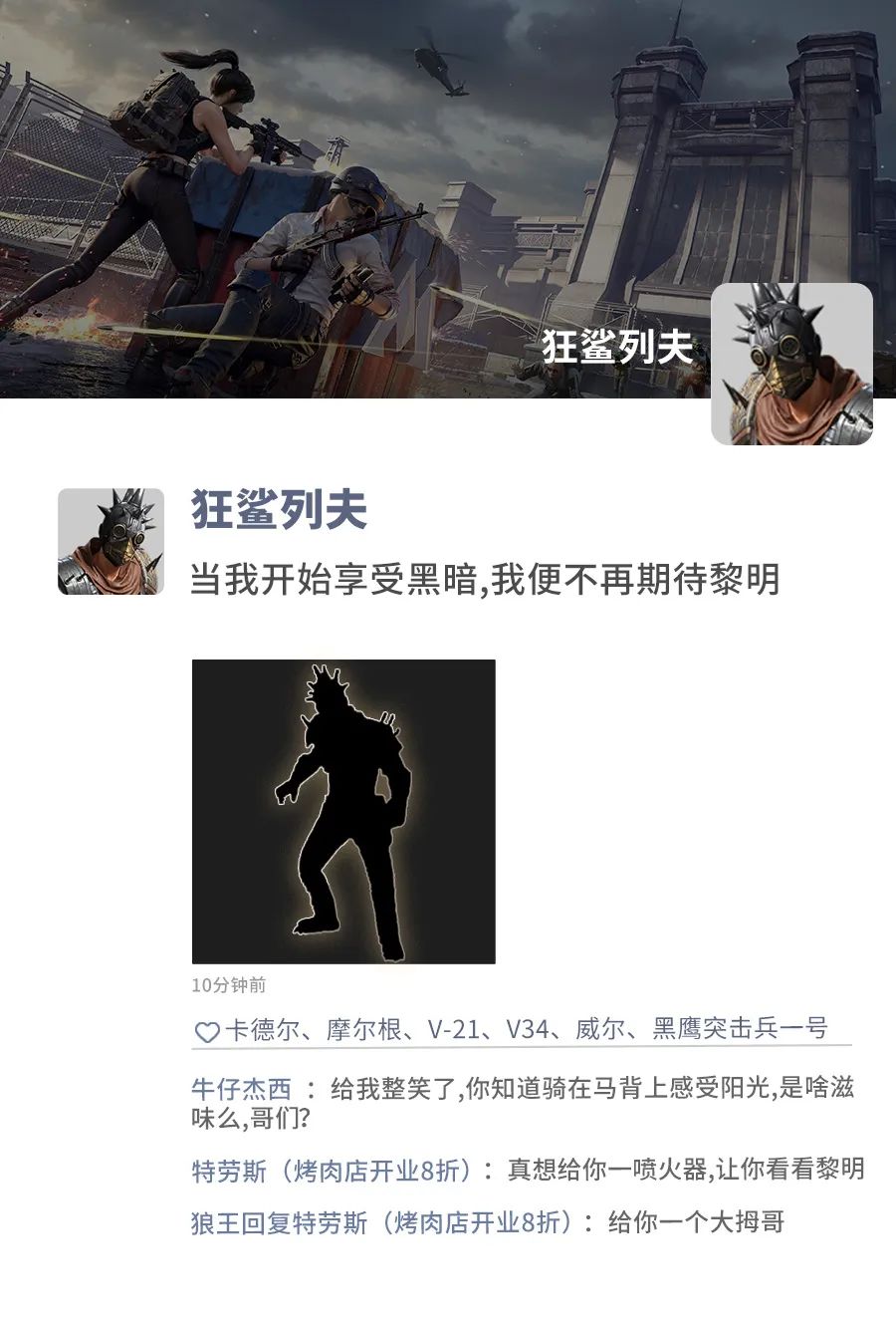 本文分享了地铁逃生的地铁BOSS们的“精装修”朋友圈,展示了摩尔根、狂鲨列夫、维列、洛金、怀特的朋友圈内容与互动,邀请特种兵留言想看的内容,鸡仔会帮忙传达。