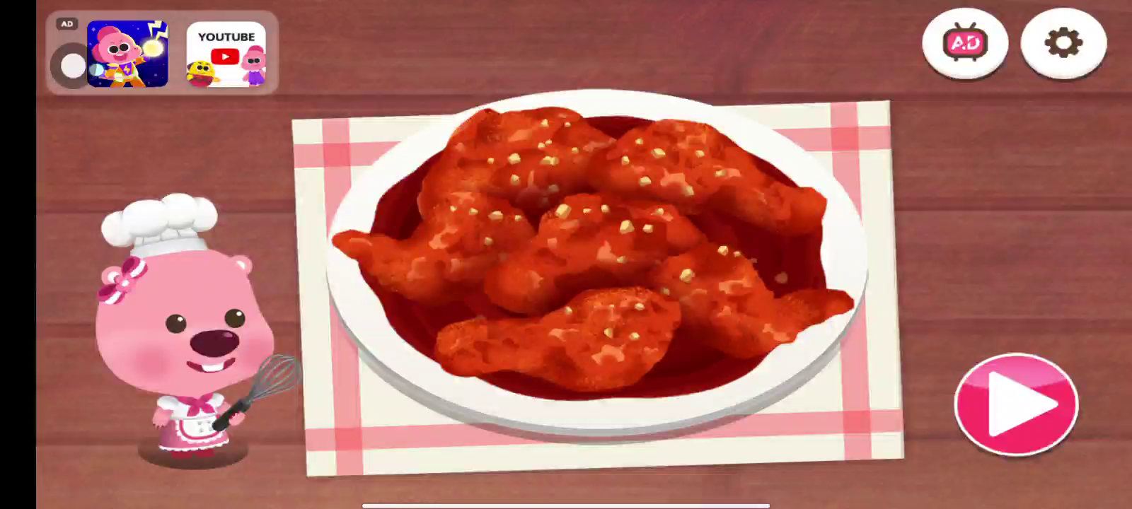 脆皮〜在咸味的鸡肉中加入辣味和甜味的调味料〜路飞的调味鸡肉已经完成!哇〜我想我真的在做饭!生动丰富的动画和声音!烹饪过程既简单又有趣!如果一一制作,您将获得一道绝妙的菜!您可以均匀地吃各种食物!我们准备了各种食物和食材,使您养成健康的饮食习惯,调味鸡是30种Pororo烹调游戏系列之一,通过烹饪游戏,您将对各种食物产生兴趣并熟悉烹饪食材和工具。满足丰富多样的内容〜