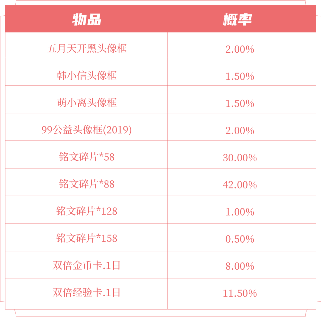 打开后可随机获得以下奖励之一:五月天开黑头像框、韩小信、萌小离头像框、99公益头像框(2019)、双倍金币卡:1日、双倍经验卡:1日、铭文碎片x158/128/88/58。
