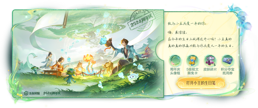 10月26日小王将通过邮件向大家发送感谢生日笺。领取后可获得周年庆限定头像框,皮肤碎片*5,积分夺宝抵扣券*1,五级铭文卡*1。希望大家玩得开心~