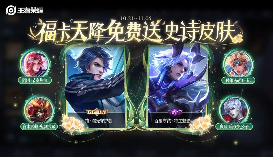 10月26日当天首次抽取福卡必出史诗皮肤,同时开放奖励领取。刷出的福卡奖励还能送给好友传递好运哦~
