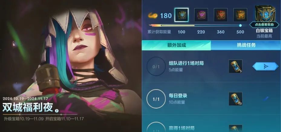 截止至11月17日,召唤师完成任务获取能量,即可提升战斗之夜皮肤宝箱等级,更有龙魂水晶好礼等你来拿。11月10日当天登录即可开启宝箱,最高可获得史诗皮肤!