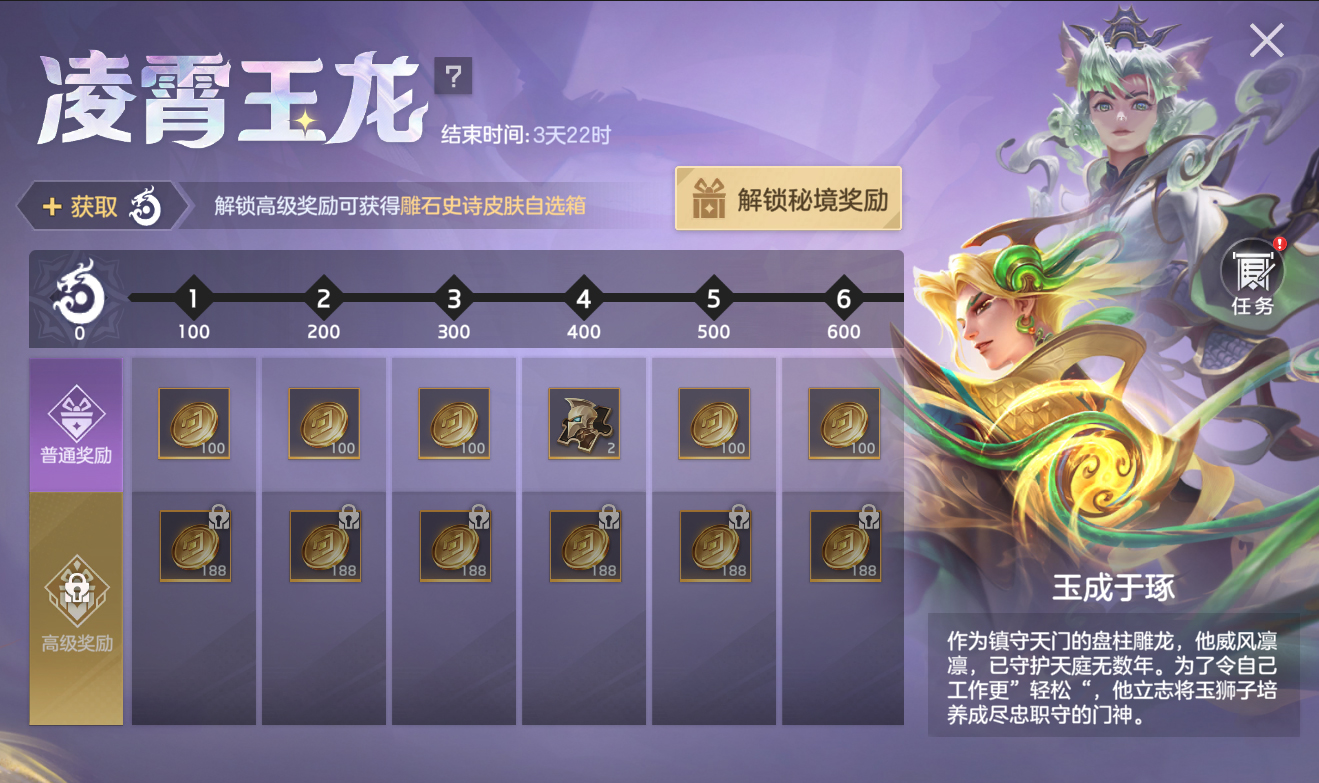 活动期间,完成对局任务,提升等级可免费获得英雄碎片、金币,付费6元解锁金星可以获得龙晶×120、龙魂祈福卡×5、皮肤碎片