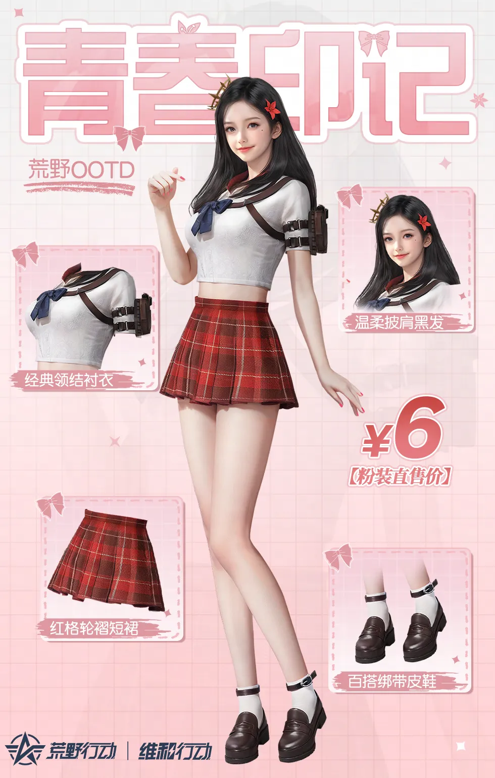 经典领结衬衣搭配红色轮褶格裙,青春涌现!衬衣的剪裁简洁大方,细节展现人物腰线;超短的经典格裙,刚好展现出修长的腿部线条,在作战中更能凸显出角色的青春活力。
