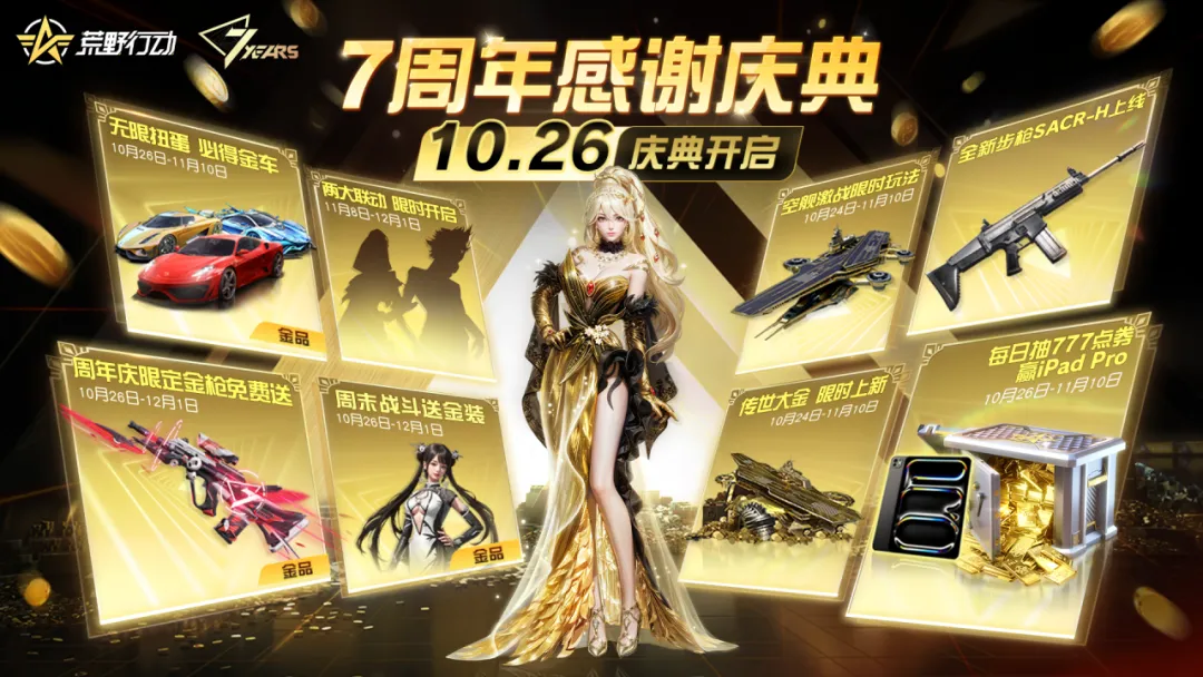 航母凌空,神秘来客降临,人工天使苏醒,战斗一触即发。来者究竟是敌是友?10月26日,来荒野行动共庆7周年,一探究竟!而且当天还有丰厚的福利等着大家,重点荒弟已经划好了,赶紧保存下图,慢慢研究!