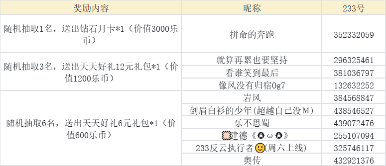 随机抽取1名,送出钻石月卡*1(价值3000乐币);