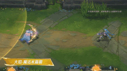 艾希的魔法水晶箭飞得越远,晕眩时间越长, 再次点击施放会进入飞箭视角,按住并拖动技能键即可控制其飞行路径,点击取消按钮,可停止操控。命中目标后同样会出现金光降临,蓝紫色烟雾弥漫的效果。