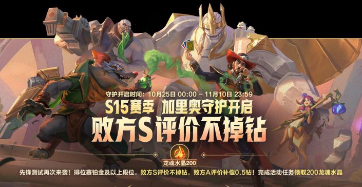 加里奥守护先锋测试再次来袭!10月25日(明日)00:00至11月10日23:59测试期间,排位赛华贵铂金及以上段位,败方S评价不掉钻,败方A评价补偿0.5钻!