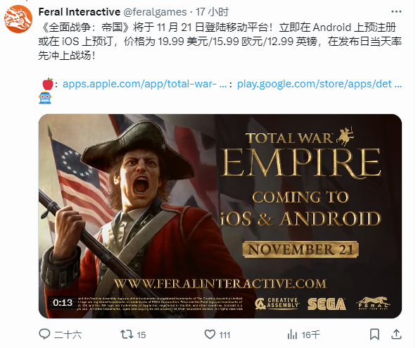 Steam特别好评策略战争游戏《全面战争:帝国》开发商宣布,游戏将于11月21日登陆海外安卓及iOS平台,目前游戏已在海外开启预注册。