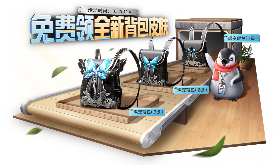 10月25日-11月4日,特种兵们可以通过消耗道具,管理企鹅工厂中的企鹅状态,加速背包的生产速度,累计可领取全套【蝶变背包】!
