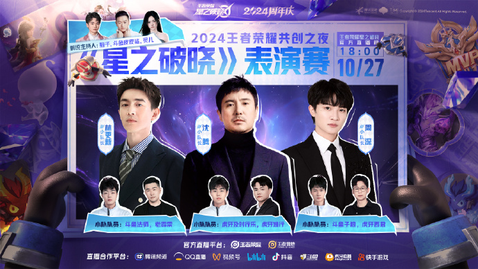 10月27日晚18:00,锁定【王者荣耀星之破晓】官方直播间,Bilibili、抖音、斗鱼、虎牙、快手、腾讯频道、QQ直播、微信视频号、王者营地同步直播!
