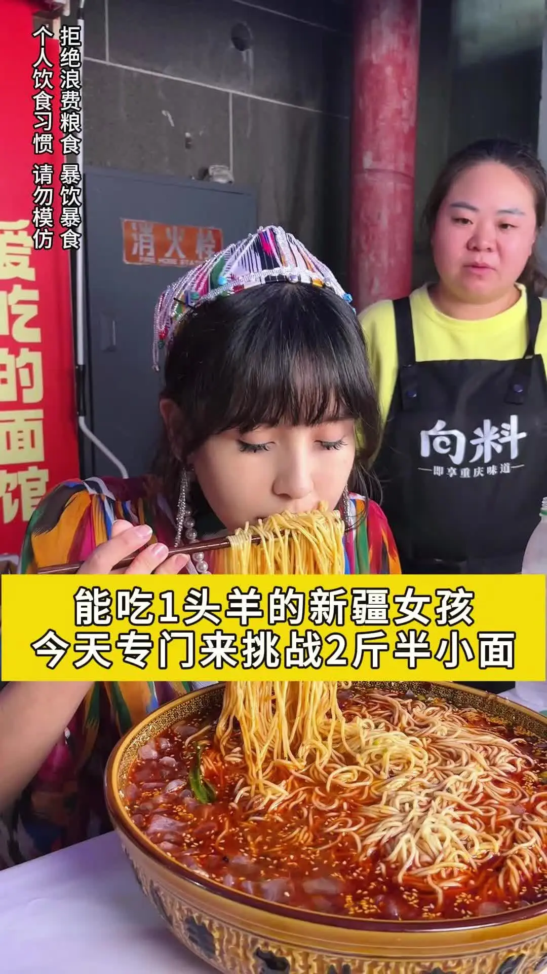 新疆美女能吃10只羊头和1只烤全羊,今天专门到重庆来挑战2斤半小面#挑战#重庆小面 #这一碗好过瘾