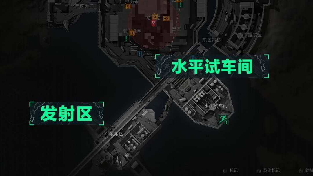 东南方的水平试车间主要为撤离区,有一个需要扔掉背包的条件撤离点但资源较少,只有1台电脑机箱和1个抽屉柜值得搜索。