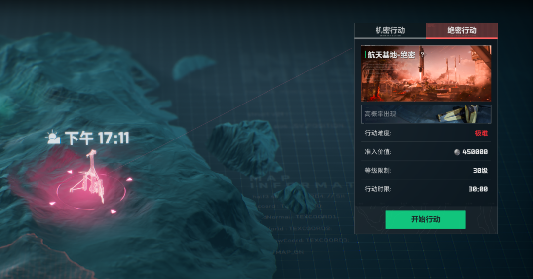 当行动等级达到18级,航天基地将向大家开放。需要注意,这里不仅有“机密行动”,还有30级开放的“绝密行动”,“绝密行动”难度更高,但物资回报也更丰厚!