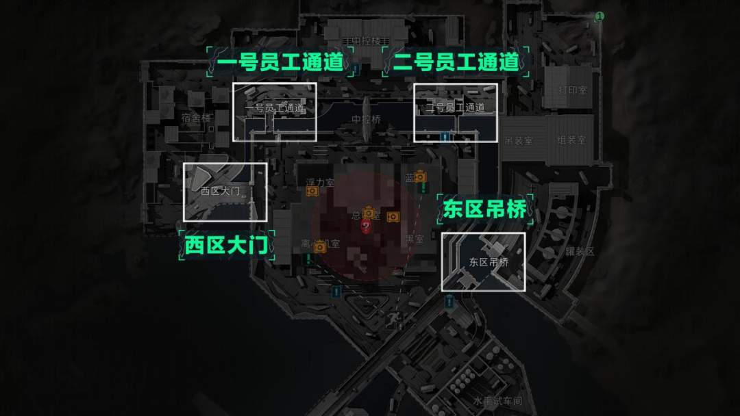如果降落点距离中控楼较远,建议选择从西侧背后的大门进入,或是从东侧二楼窗口进入,避免遭遇第一顺位的其他小队架枪蹲守。