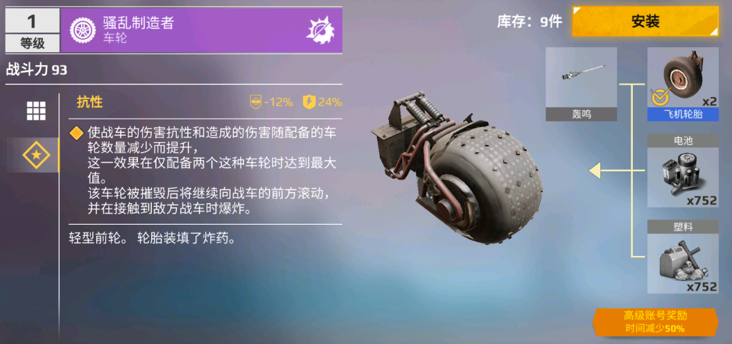 |- 移动装置:史诗级前置车轮"骚乱制造者" * 1,车轮"飞机轮胎" * 2