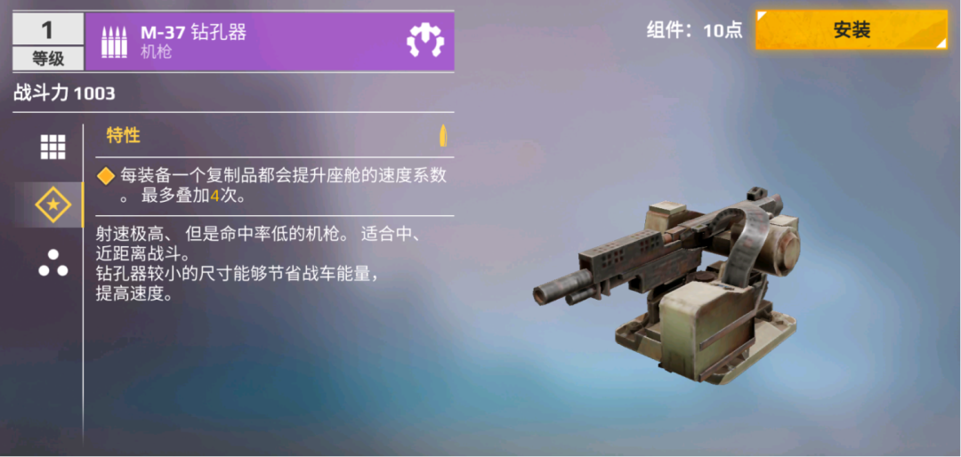 "M-37钻孔器"是一款速射型机枪,具有极高的射速和连发模式,相对应的无法期待它单次射击具有高精度和高额伤害。但是它可以提供令人赞叹的火力密度。有趣的是,该武器能够提升座舱的速度属性。因此很经常能够看到一些奇景:竞速用的赛车带着一些钻孔器,然后轻而易举的就能达到100km/h以上的速度。作为一款速射机枪,其连续射击的续航差、射程短并且具有相比之下更大的扩散。但是,它有着独一无二的高射速,在极端近距离的战车格斗战中会更为有效,击中部件的感觉非常良好,能够以一种优秀的速度来拆毁目标战车的部件。
