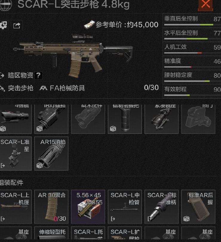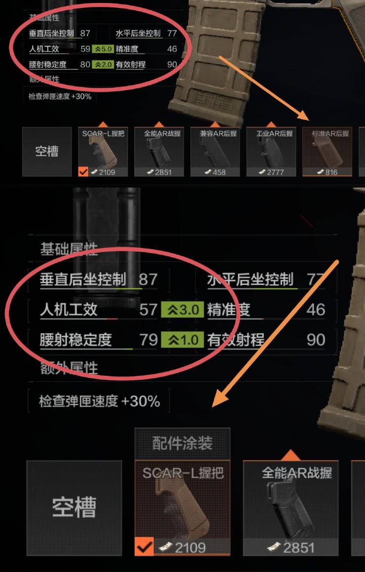冷知识:(SCAR-L)的专属握把的价格在2000,但加成的属性却不如(标准AR后握),不过握把给的加成是人机功效与腰射稳定,前期萌新几乎是感受不到这些属性高低有什么差距的(我一开始也一样,所以并不需要特别去在意)