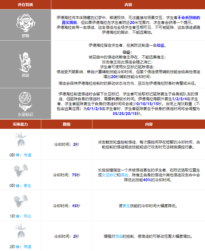 据说从地球上出现第一个微生物前伊德海拉就已经存在了。在这数十亿年间,随着时间流逝,伊德海拉从变化中获得了一种奇特的能力,吞噬周遭的生物以获取他们的特性。因此伊德海拉可分裂出不同的面貌的分身,而每一个分身都共享本体的意识。 通过与伊德海拉相融合,信徒会获得永生。她通常将自己的本体隐藏在强力的幻影中,只有受召的信徒才有机会一窥她幻影下的真容。