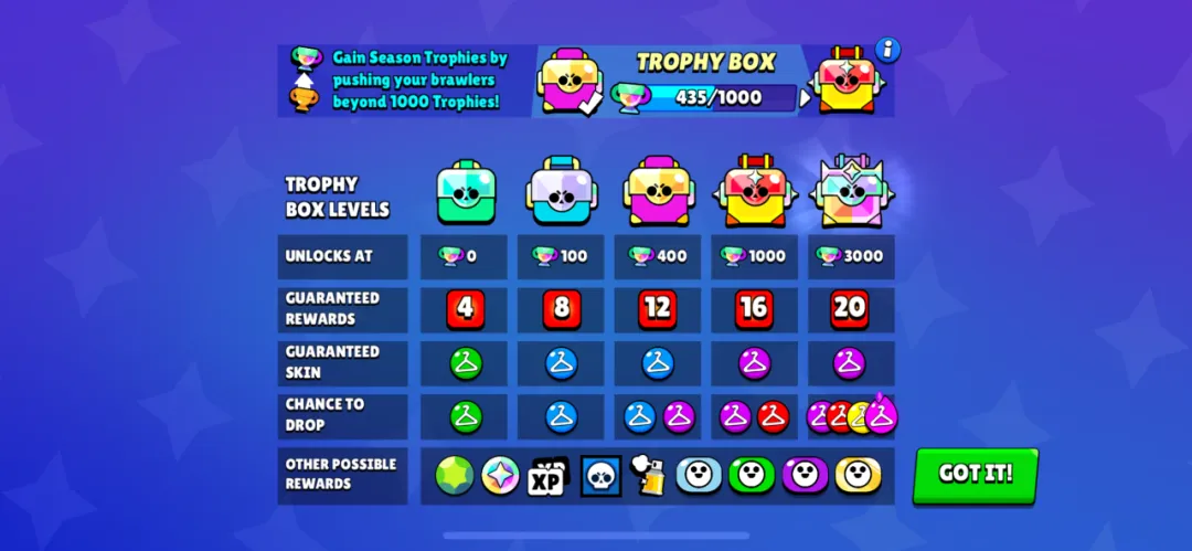 2. 超过1000奖杯后的奖杯都算作赛季奖杯。赛季奖杯会提升你的荣誉宝箱等级。
