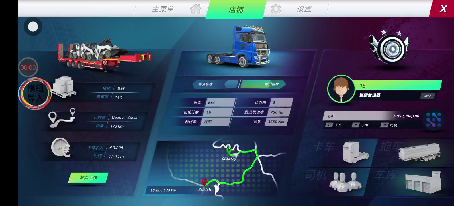 欧洲卡车模拟器3是一款卡车驾驶模拟游戏,您将花时间完成收到的请求。每个请求都会引导您前往一个令人惊叹的地方,并且需要花费一些时间才能到达那里。同时,你会在游戏中解锁很多东西,尤其是体验新卡车。 在令人印象深刻的模拟世界中驾驶真实的卡车 在《欧洲卡车模拟器3》中,玩家将进入令人印象深刻的卡车驾驶模拟游戏,在这里您将能够探索具有许多不同环境元素的广阔世界。同时,总会有一些任务需要你通过并正确完成才能在游戏中收集一定数量的金钱。前往许多地方并接受多种类型的工作将是一段让玩家有大量时间体验令人印象深刻的旅程。 选择有挑战性的工作来赚钱 当您启动《欧洲卡车模拟器3》时,您将看到您的车辆和您拥有的个人资料,其中列出了您在游戏中拥有的内容。同时,这也是您从事各种工作并在车道上发现新事物的地方。您将看到您要牵引的拖车类型以及如果您很好地完成此要求您可以获得的金额。收到后,您将把车辆开到拖车处,并按照 HUD 到达指定位置。