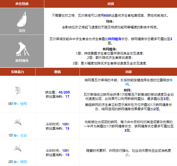 在一位机械师的帮助下,瓦尔莱塔给自己装上了灵活的机械义肢和一些精巧的机关装置。她创造出了新的表演项目——人形蜘蛛秀。老东家拒绝了她的演出,可瓦尔莱塔没有气馁。她接受了一份演出邀请,并准备在欧利蒂丝庄园举行自己的复出秀。