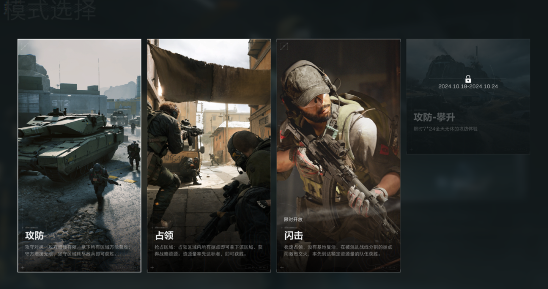 攻防和占领模式都是32 VS 32的大战场。攻防模式下,攻方增援有限,拿下所有区域方能获胜。守方增援无限,坚守区域耗尽敌方兵力即可获胜。