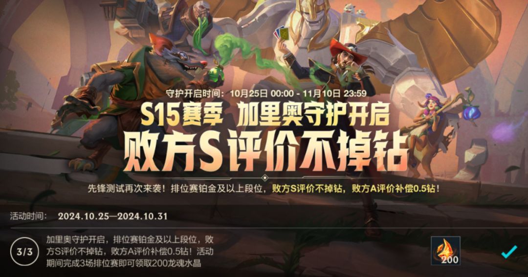加里奥守护开启!截止至11月10日,排位赛华贵铂金及以上段位,败方S评价不掉钻,败方A评价补偿0.5钻!此外,截止至10月31日,召唤师完成3场排位赛即可领取龙魂水晶*200好礼~