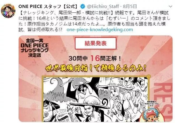 这可不是开玩笑,在2019年IP官网举办的「知识王大赛」中,尾田老师在30题中仅答对了16题,正确率勉强过半。从此,“尾田就是一画漫画的,他懂个屁的海贼”名梗正式出圈。