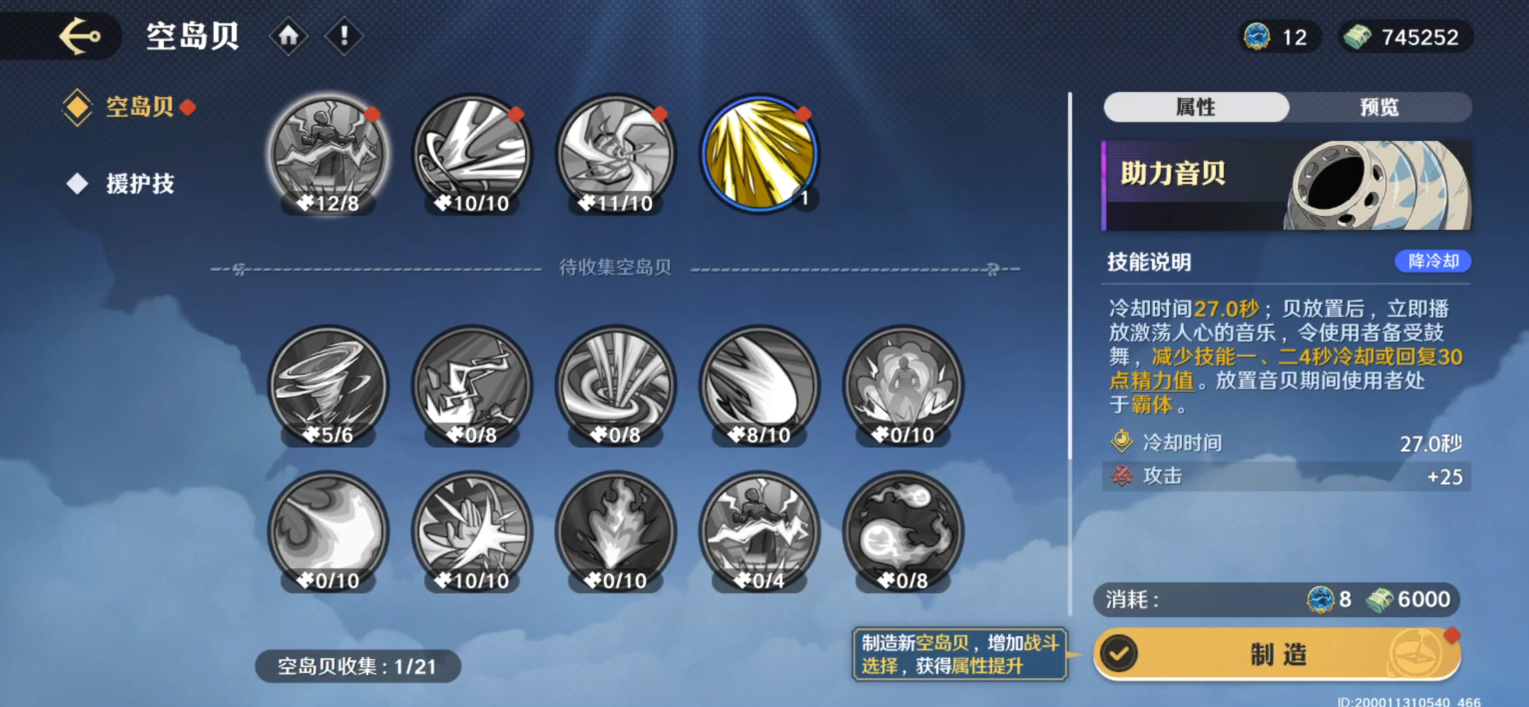 角色战斗配置统一为普攻+两个小技能+奥义的经典组合,每位角色还能携带一枚有冷却时间的「空岛贝」作为辅助,「空岛贝」与角色绑定。