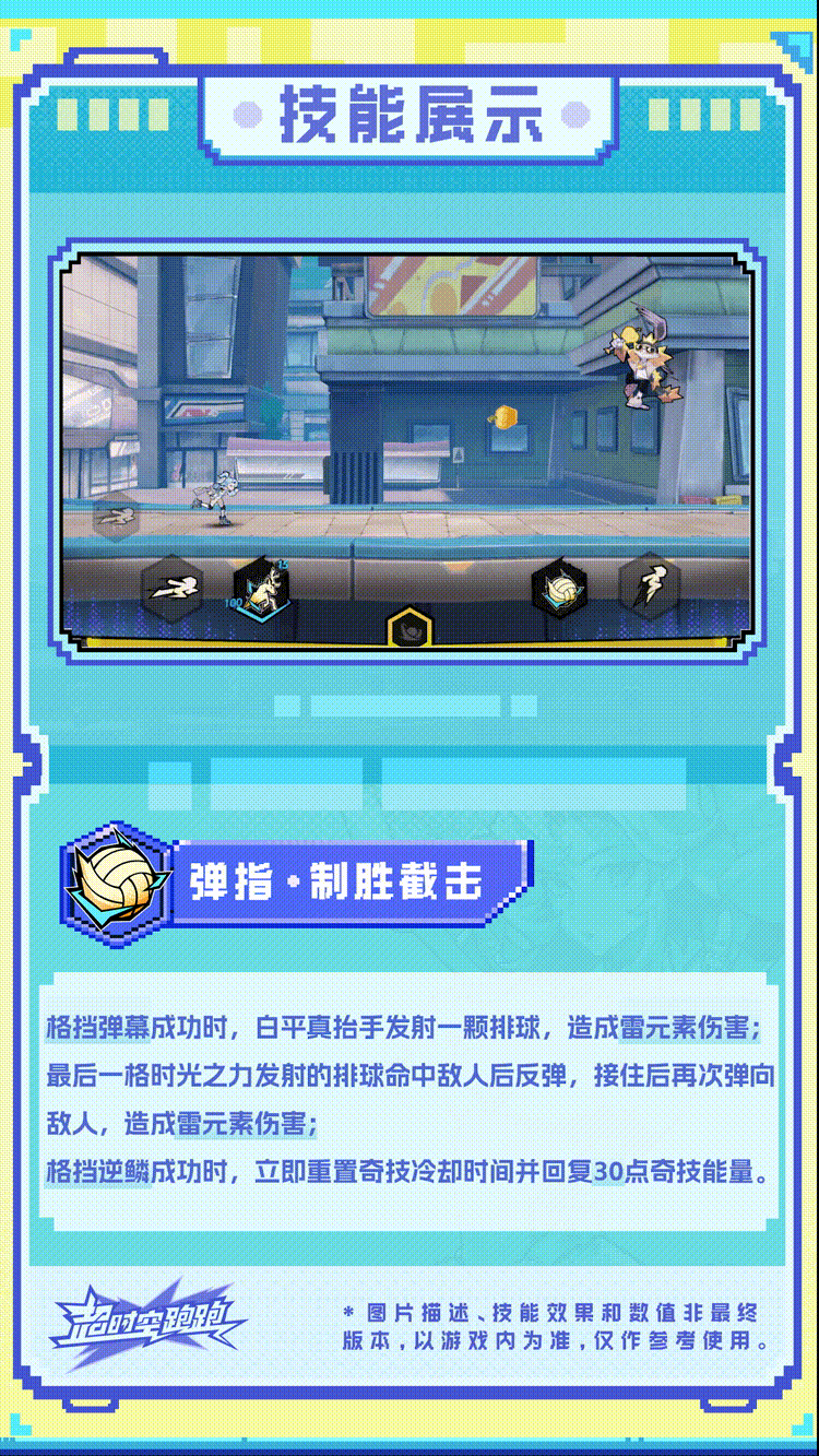 “排球是永远积极向上看的运动! ”每次格挡弹幕成功时,白平真都会抬手发射一枚排球,造成【雷元素伤害】,而最后一格时光之力发射的排球会造成反弹效果,击中后可对敌人造成一次额外的【雷元素伤害】!
