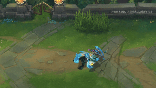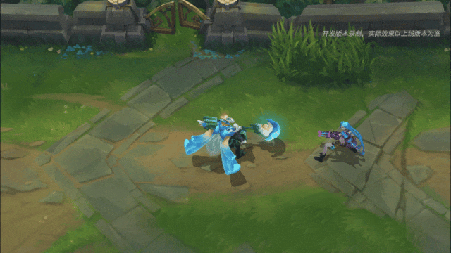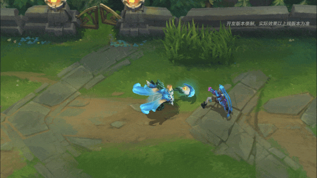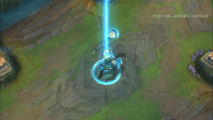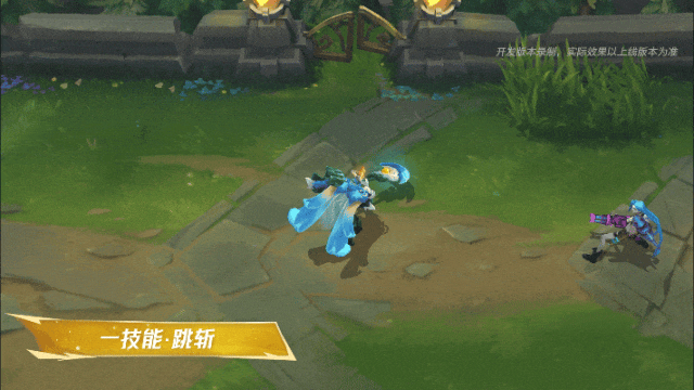 贾克斯跃向目标,起跳时会在原地留下一团蓝灰色烟雾,法杖在半空中划出一道淡青色流光轨迹,若目标是敌人,则会对其造成伤害,伴随耀眼的橙色命中特效。