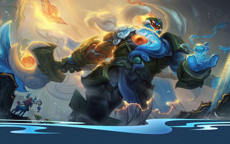主动:贾克斯紧握法杖向地面狠狠砸下,敲击出一幅美轮美奂的山海图,并对附近的敌人造成伤害,同时根据命中英雄的数量,获得一个橙蓝色渐变的泛光护盾和额外抗性,护盾外壁上还有海浪涌动。