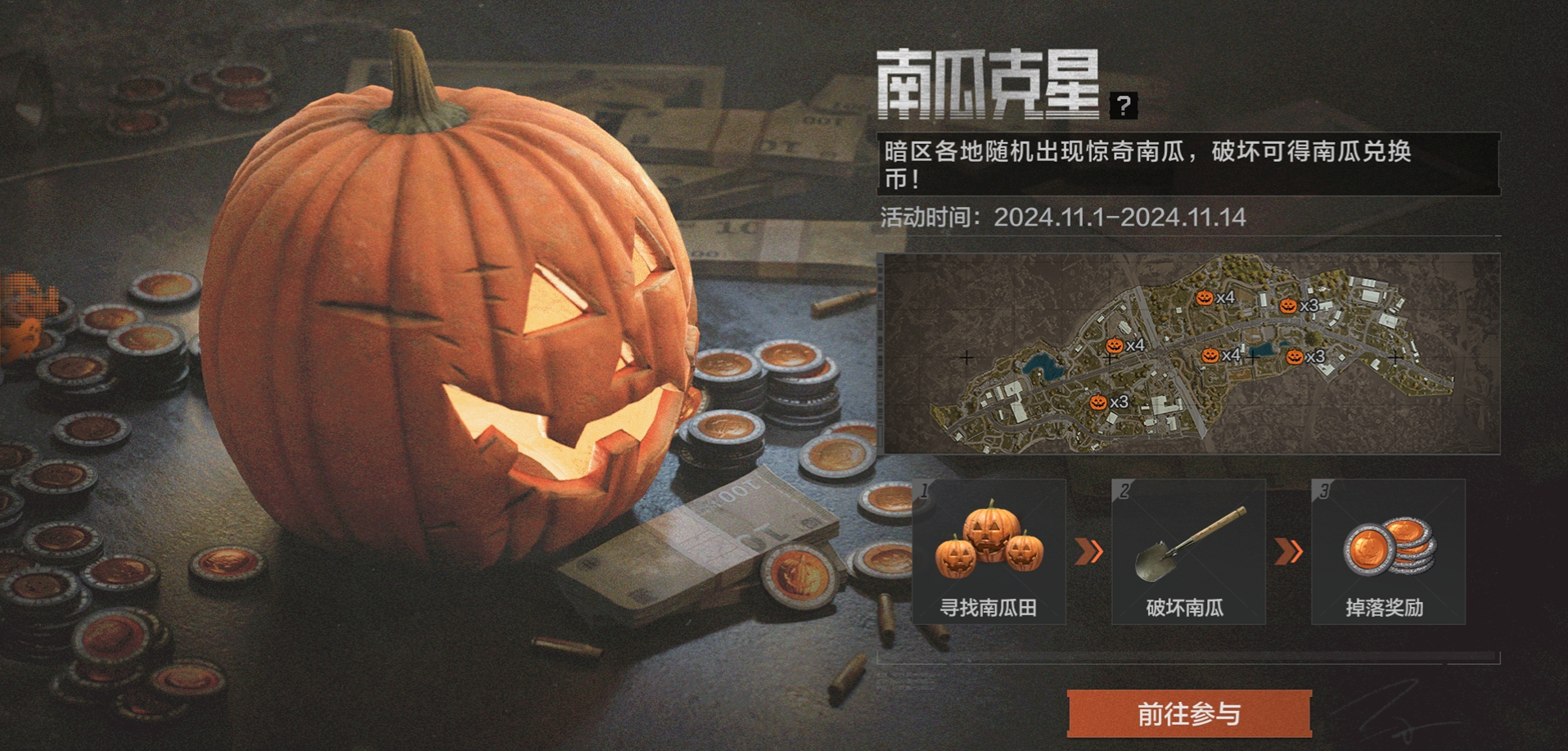 南瓜头盔限时掉落,各地出现惊奇南瓜,破坏南瓜可得南瓜兑换币,兑换限时万能钥匙,限时万能门禁卡和南瓜臭气袋等奖励!完成指定任务可获得限定挂饰!