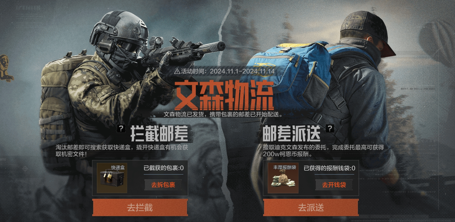 全新玩法文森物流活动即将开始,请先锋选择成为邮差接取迪克文森的委托派送,或拦截邮差截取快递盒!