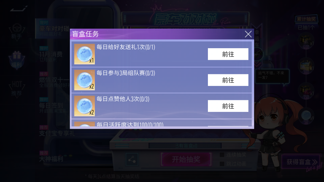 11月1日~11月21日,全新活动-赛车对对碰将限时开启,车手们每日完成对应任务可以获得对碰盲盒。每次打开盲盒都可以获得随机车辆道具用在九宫格中摆放,并累计抽奖次数解锁丰厚奖励!