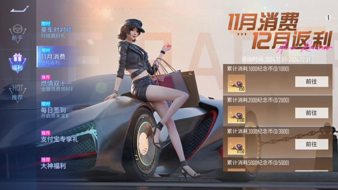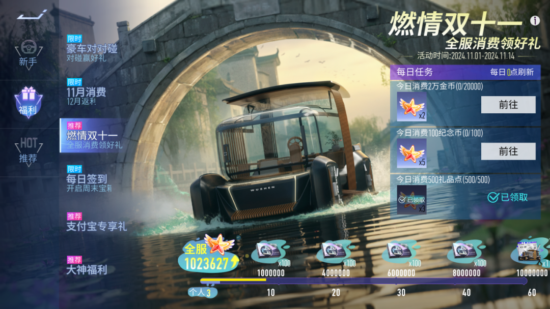 活动开启后,车手们仅需在11月消费纪念币或绑定纪念币即可逐步解锁对应返利,返利将在12月开放领取,最多可领1000枚绑定纪念币!不仅如此,11月1日-11月14日,每日完成指定消费任务还可获得个人积分,累计全服积分达到指定数量可免费领取茶韵悠长-零件和茶韵行者-蓝图奖励,千万别错过啦~