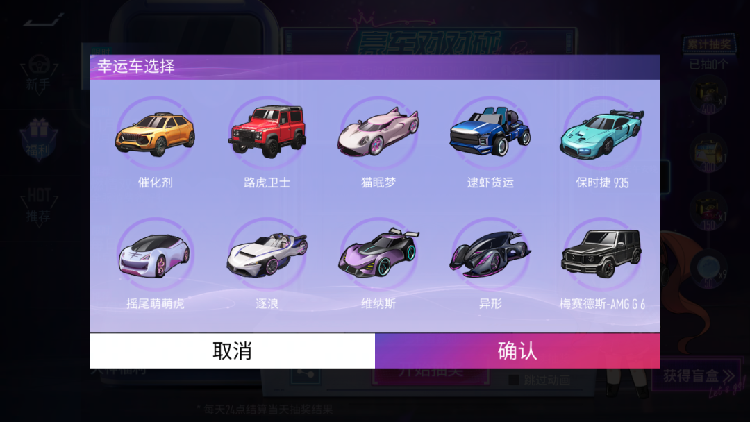 除此之外,车手们每日还可以在活动界面自选一台幸运车辆,当放置的豪车与幸运车一致时,就可以额外获得一个盲盒哦,快来试试你的手气如何,碰出更多好礼!